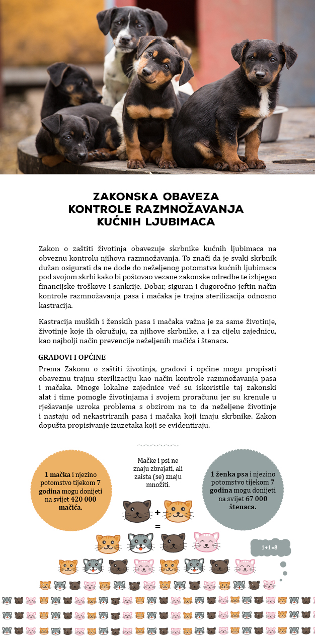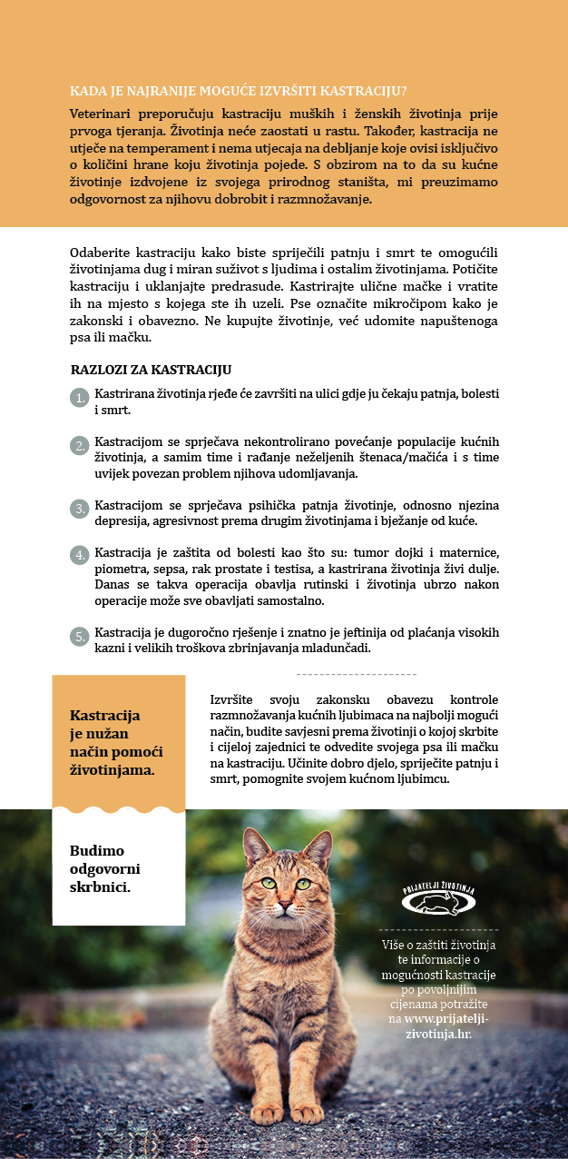 RUBRIKA ZA VLASNIKE KUĆNIH LJUBIMACA Psi i mačke traže odgovornost svih nas - letak Odluka objavljenja u Službenom vjesniku 48/18 Kada je najranije moguće izvršiti kastraciju Zakonska obveza kontrole razmnožavanja kućnih ljubimaca